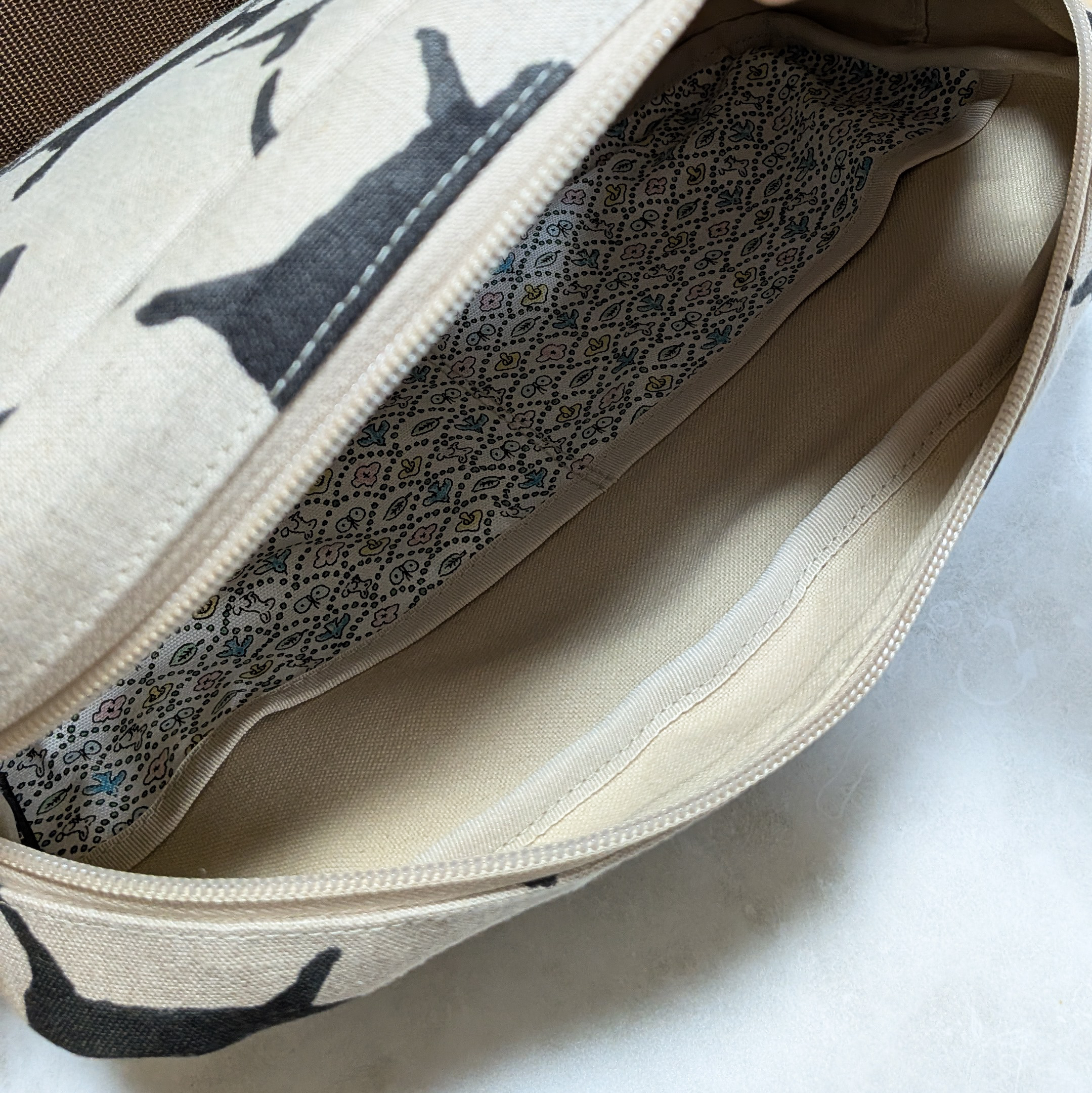 牛革とミナペルホネンのファブリックrun run runを使用したボディバッグです。