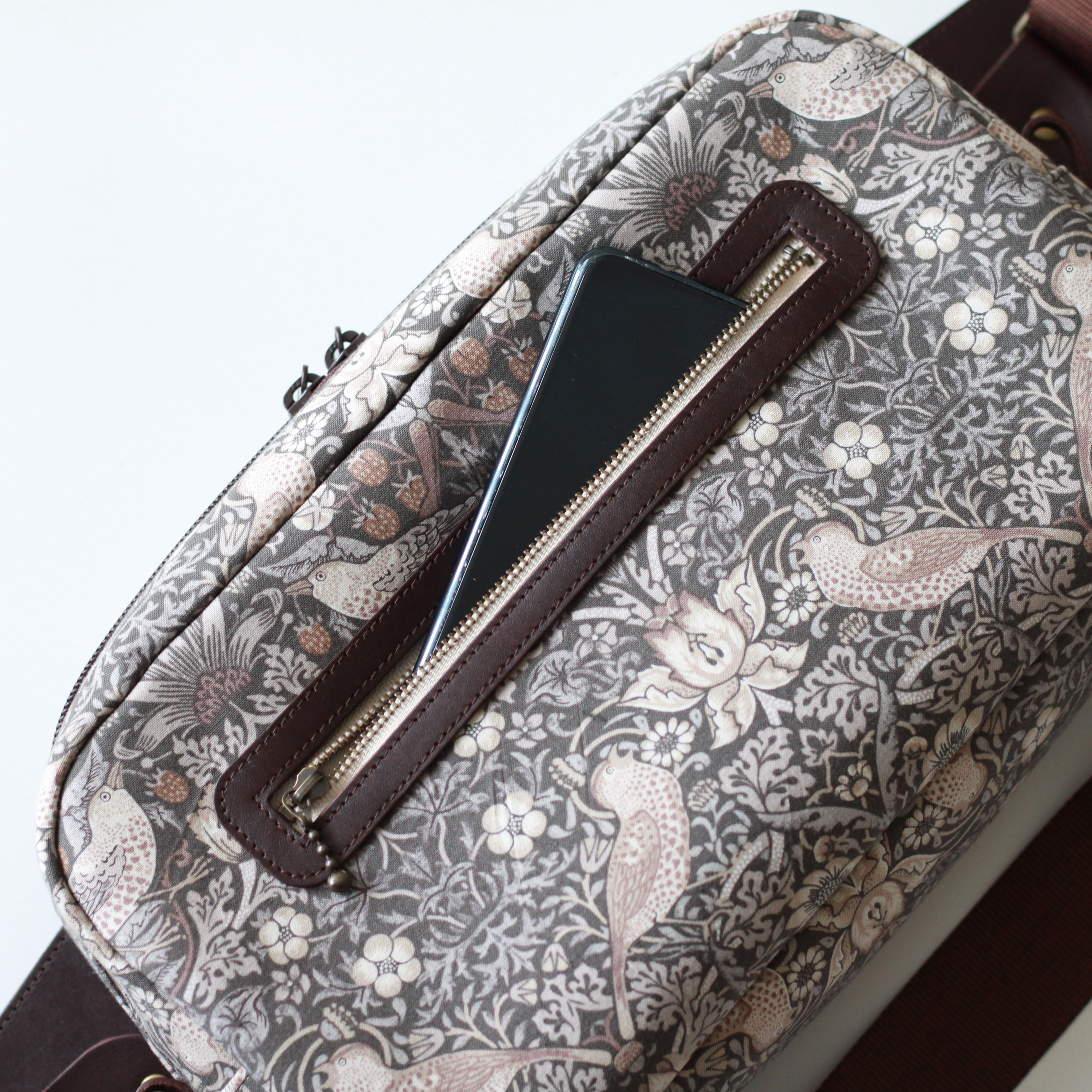 牛革とstrawberry thiefを使用したボディバッグです。