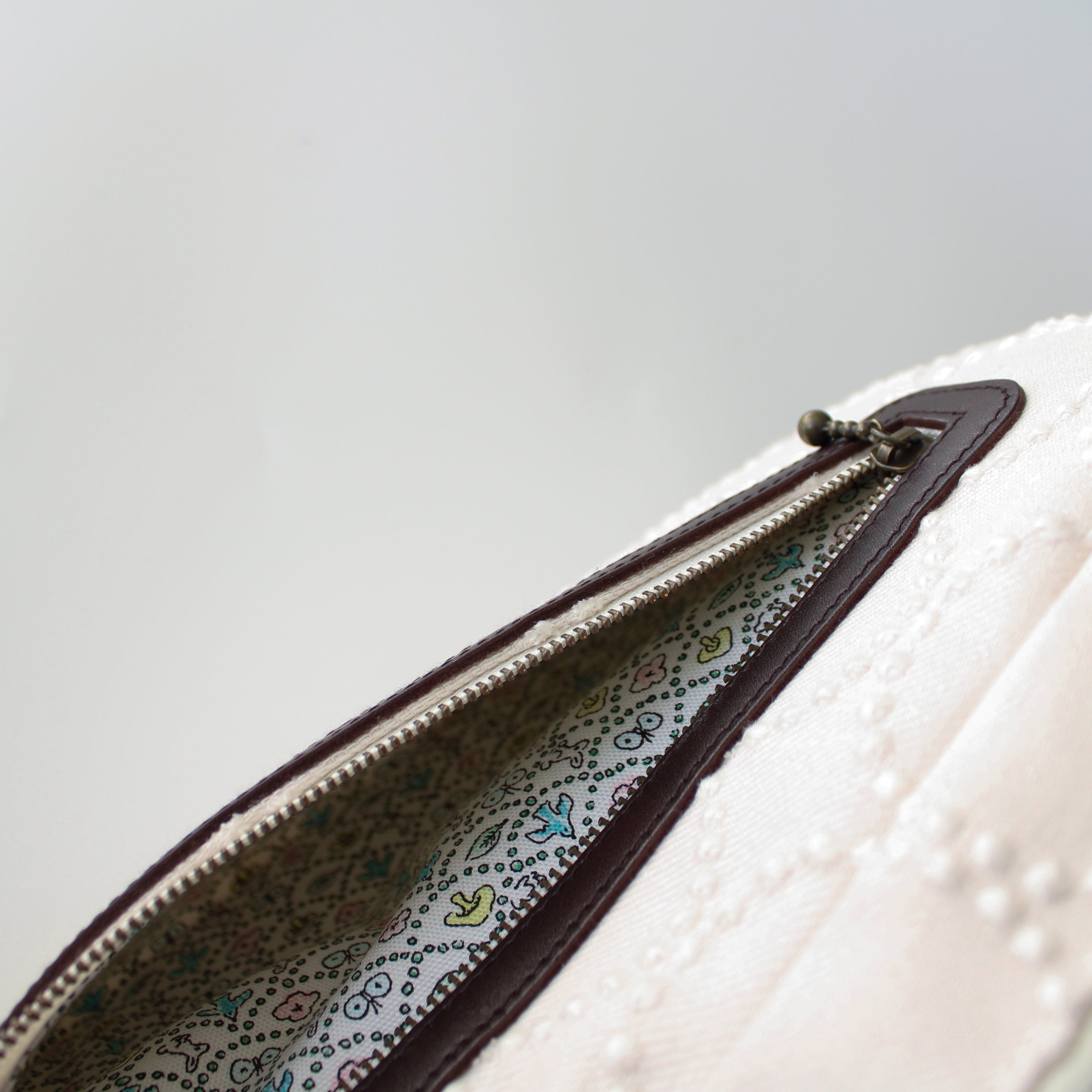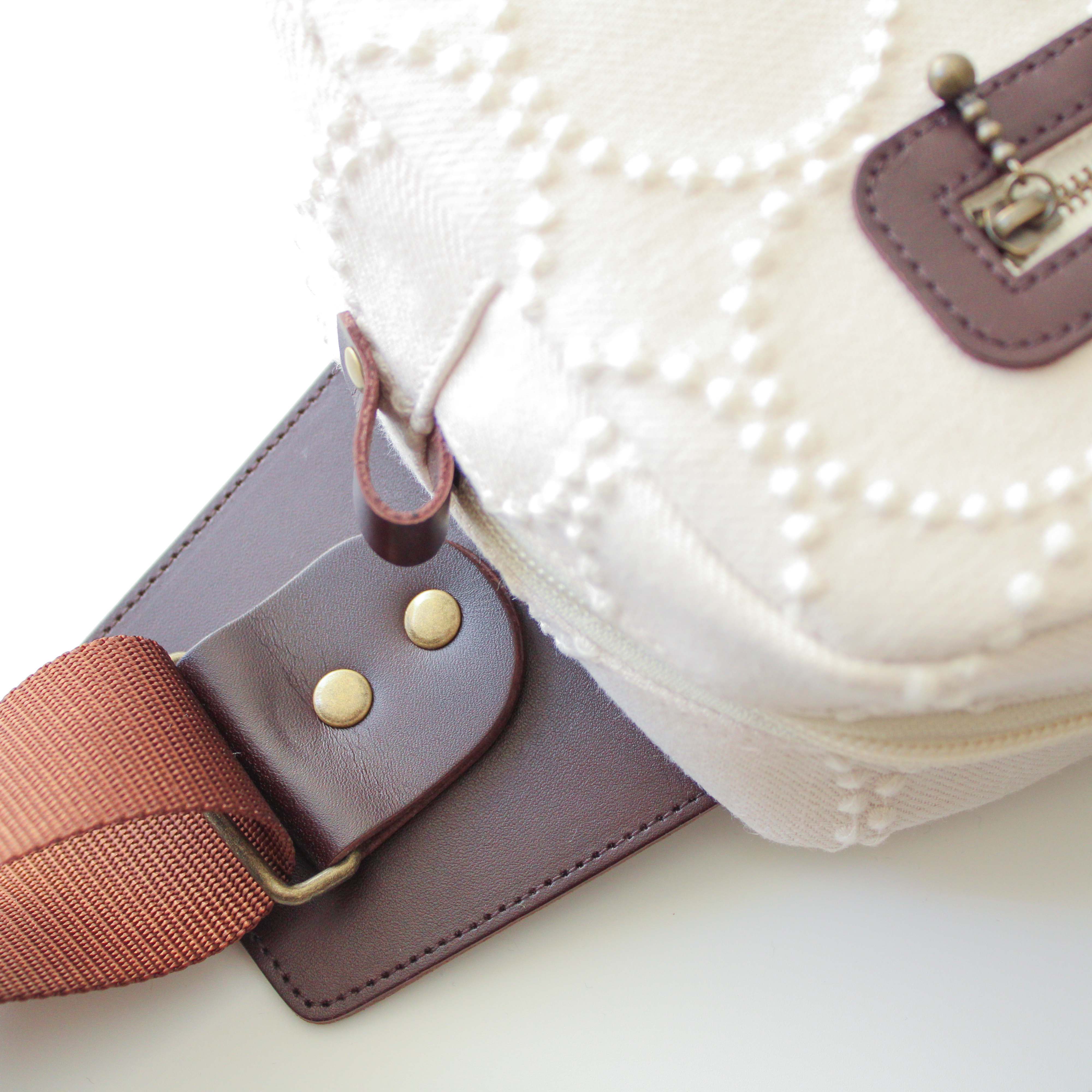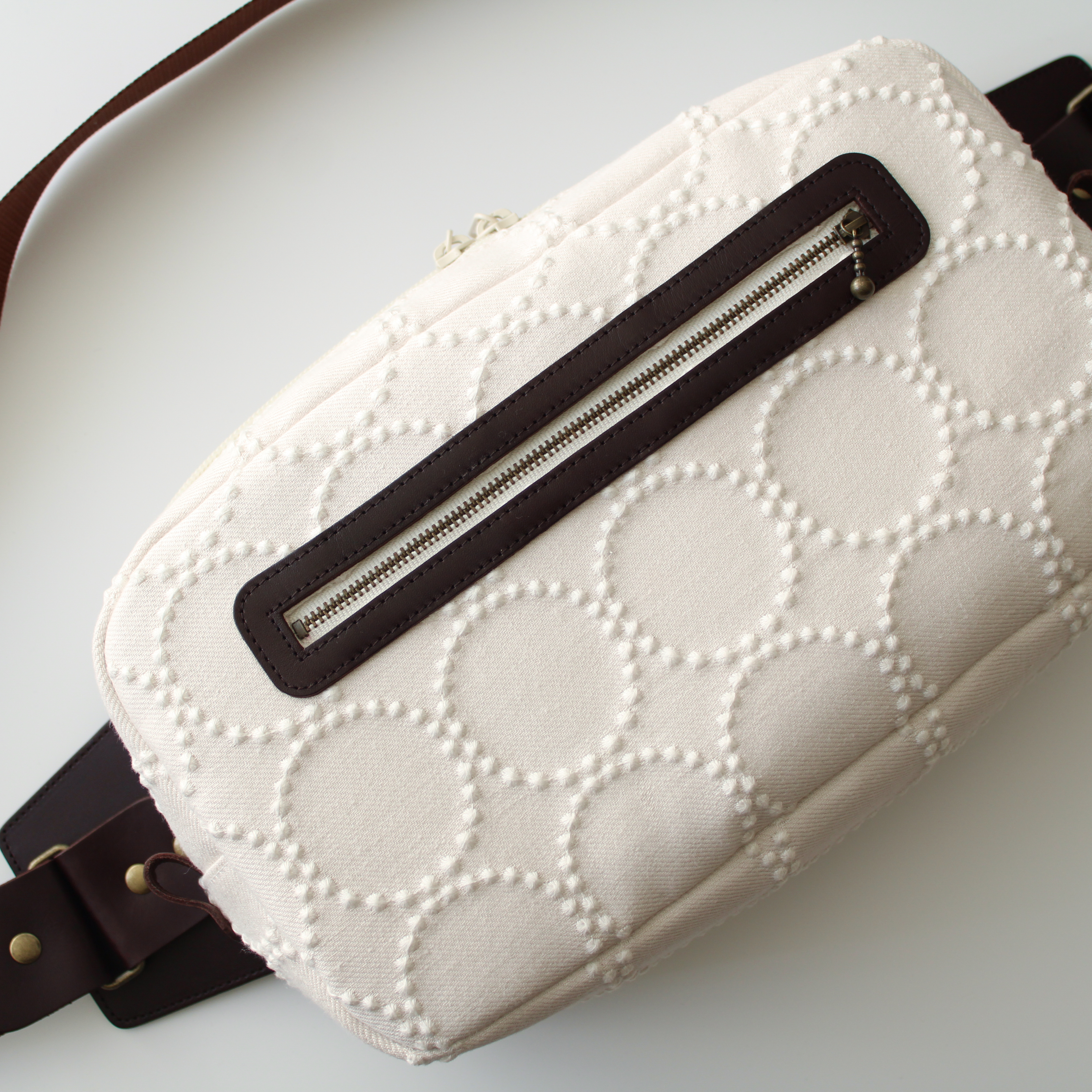 こちらは白いタンバリン刺繍の粒がよく映える生地を使っているので、本革とあわせて上品に仕上がっています✨