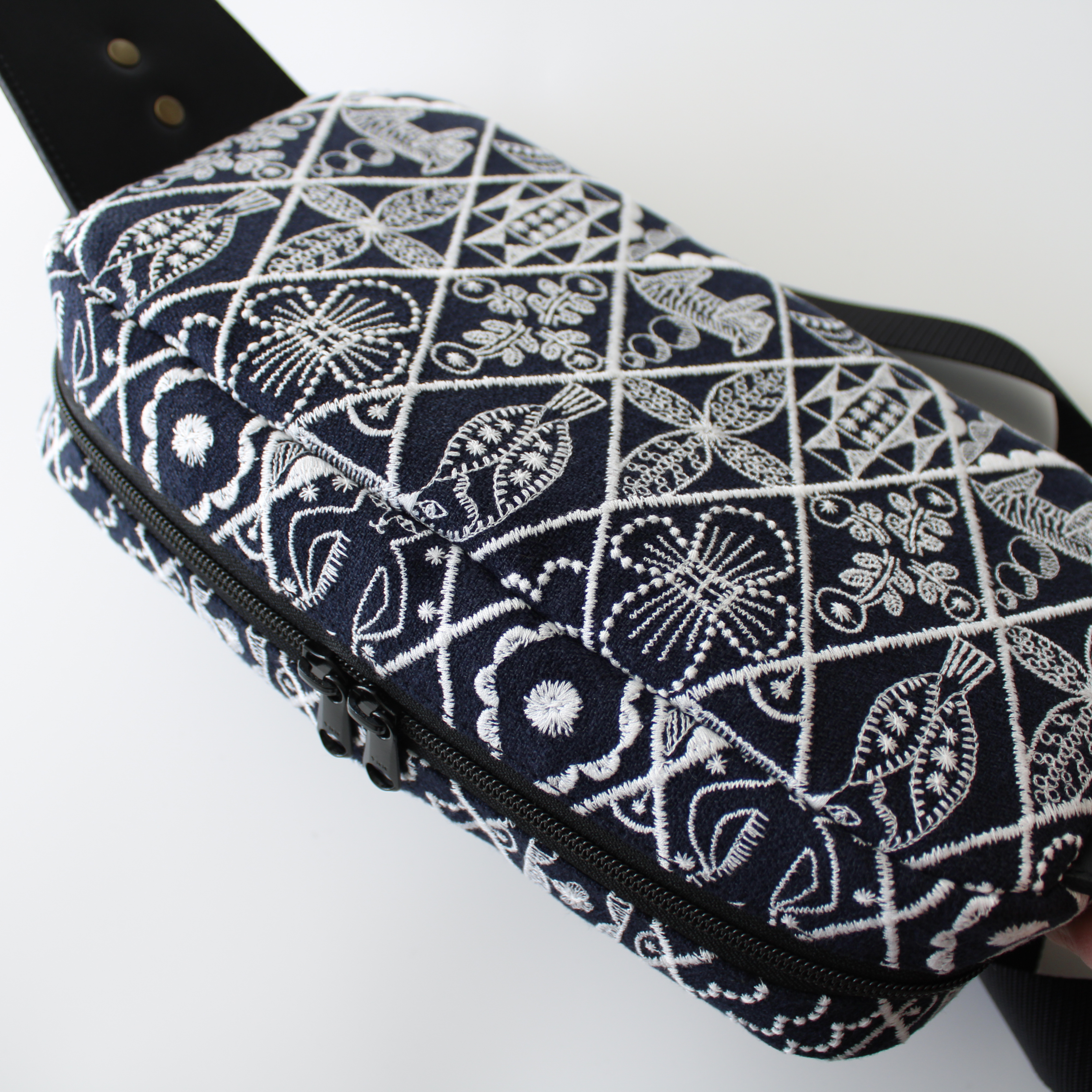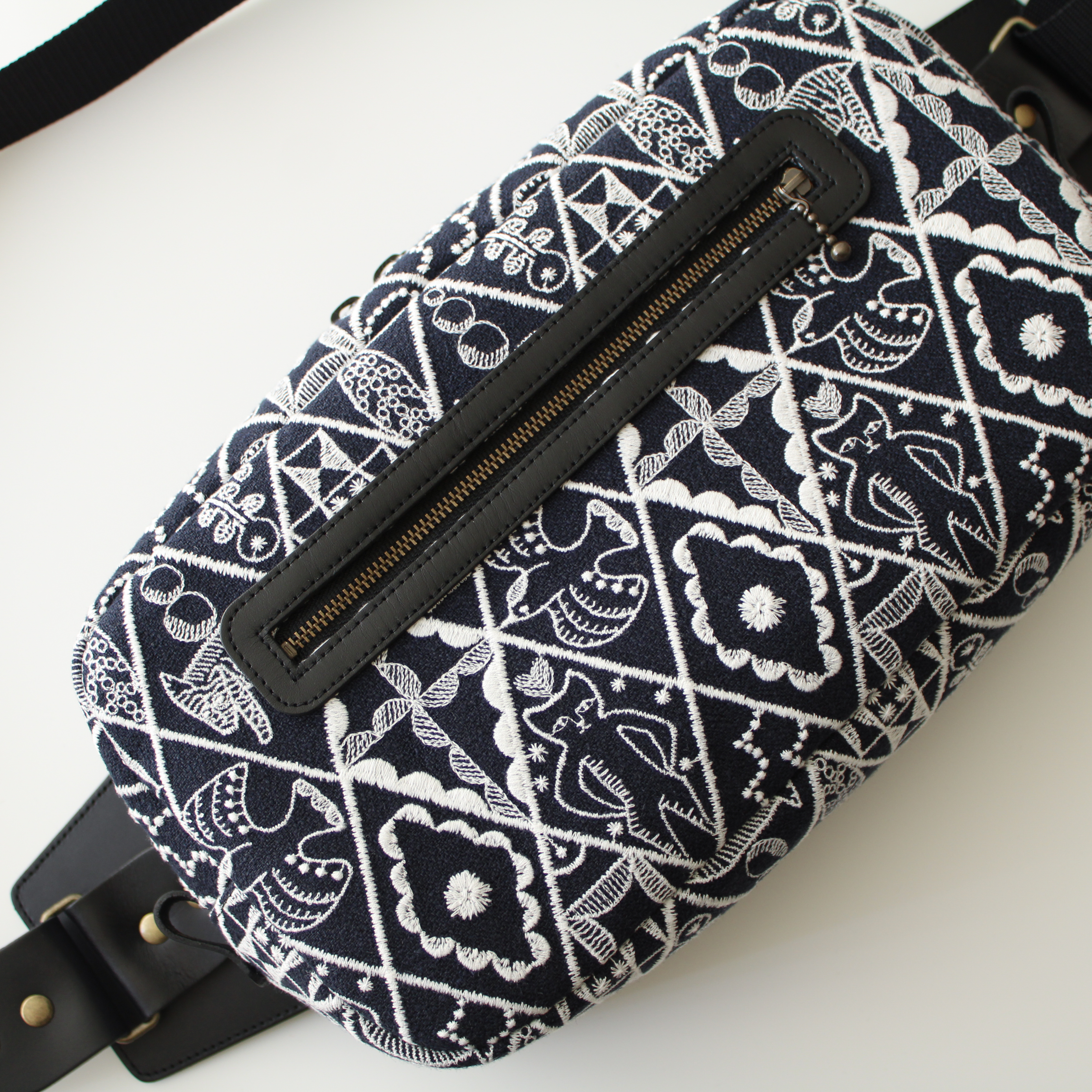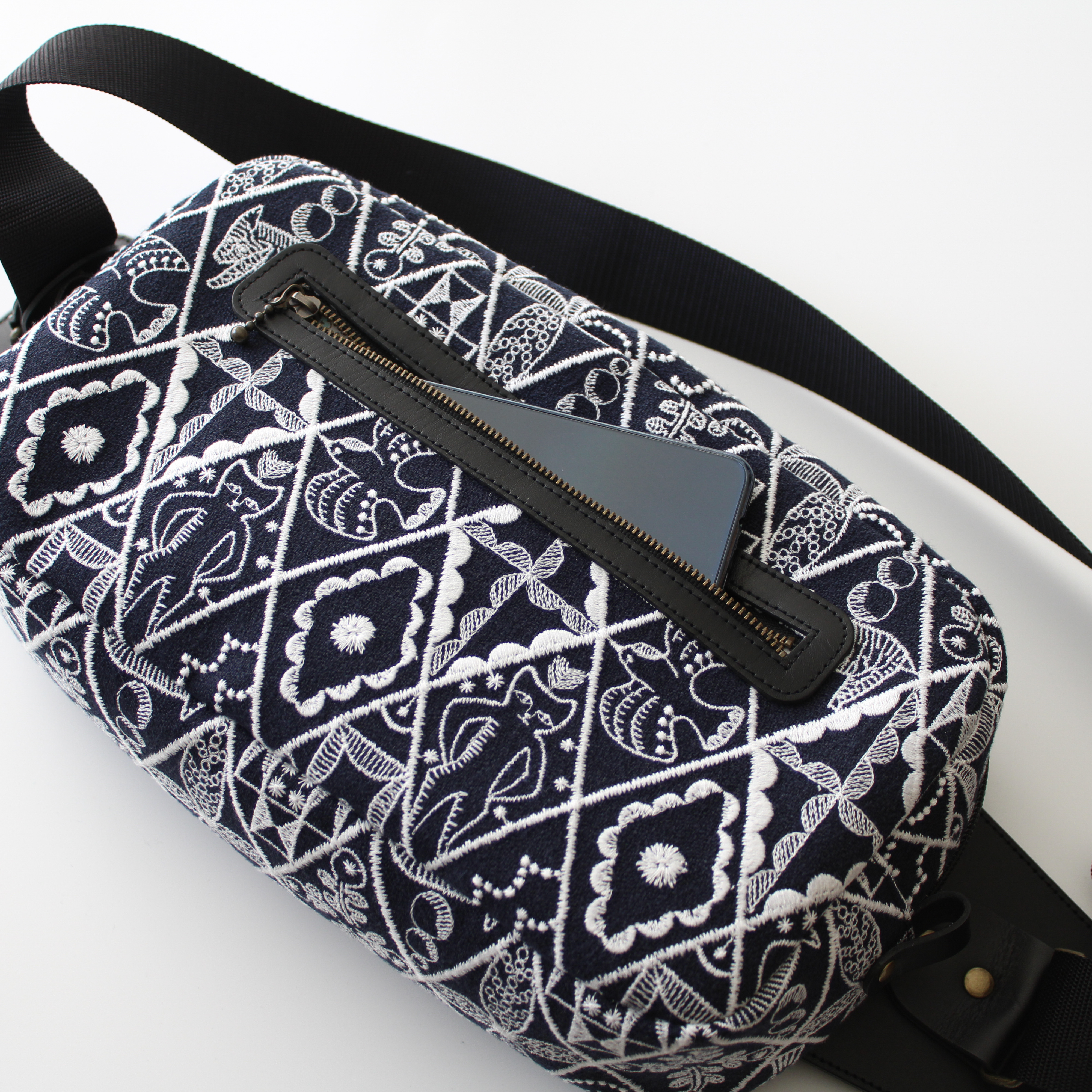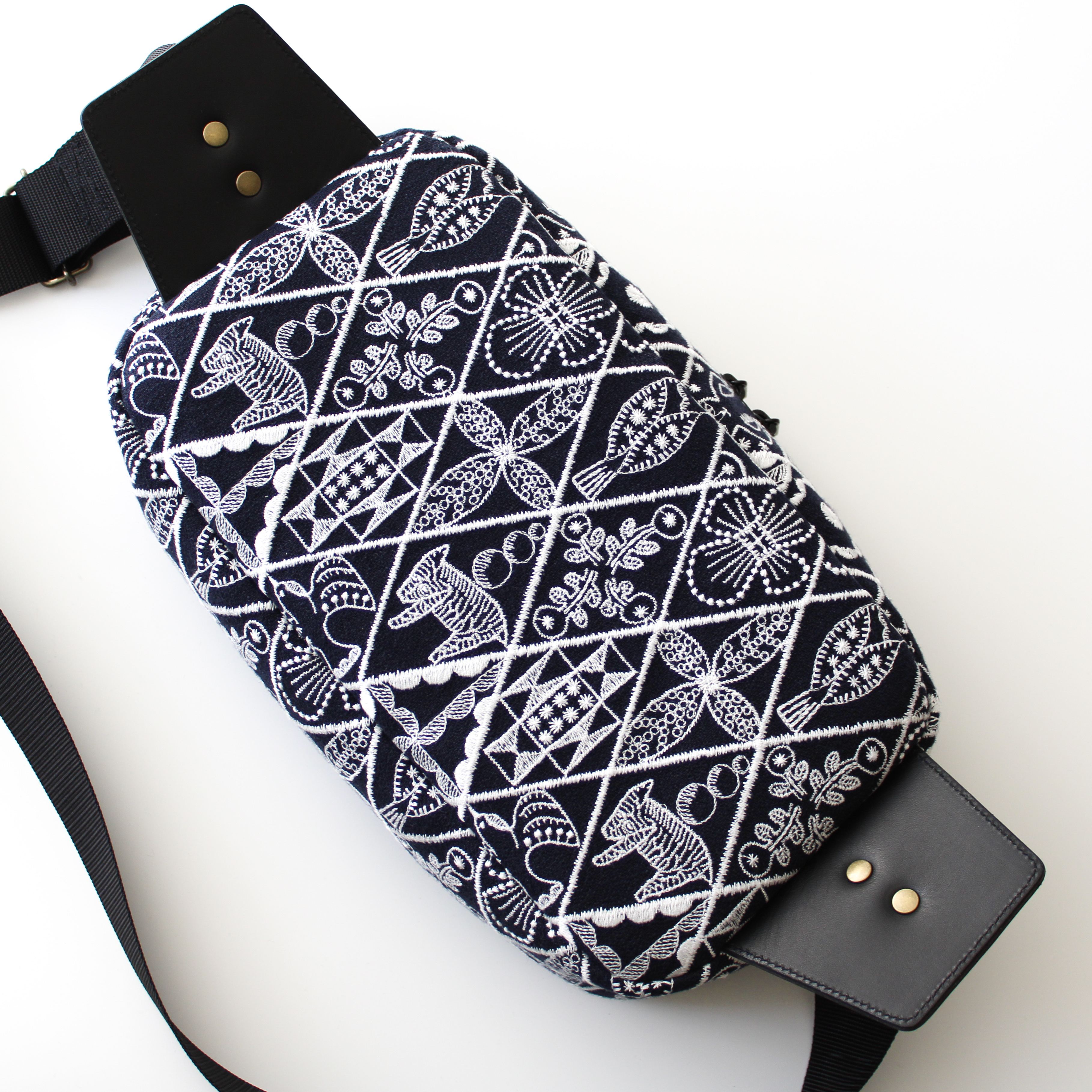 牛革とミナペルホネンのファブリックsymphonyを使用したボディバッグです。