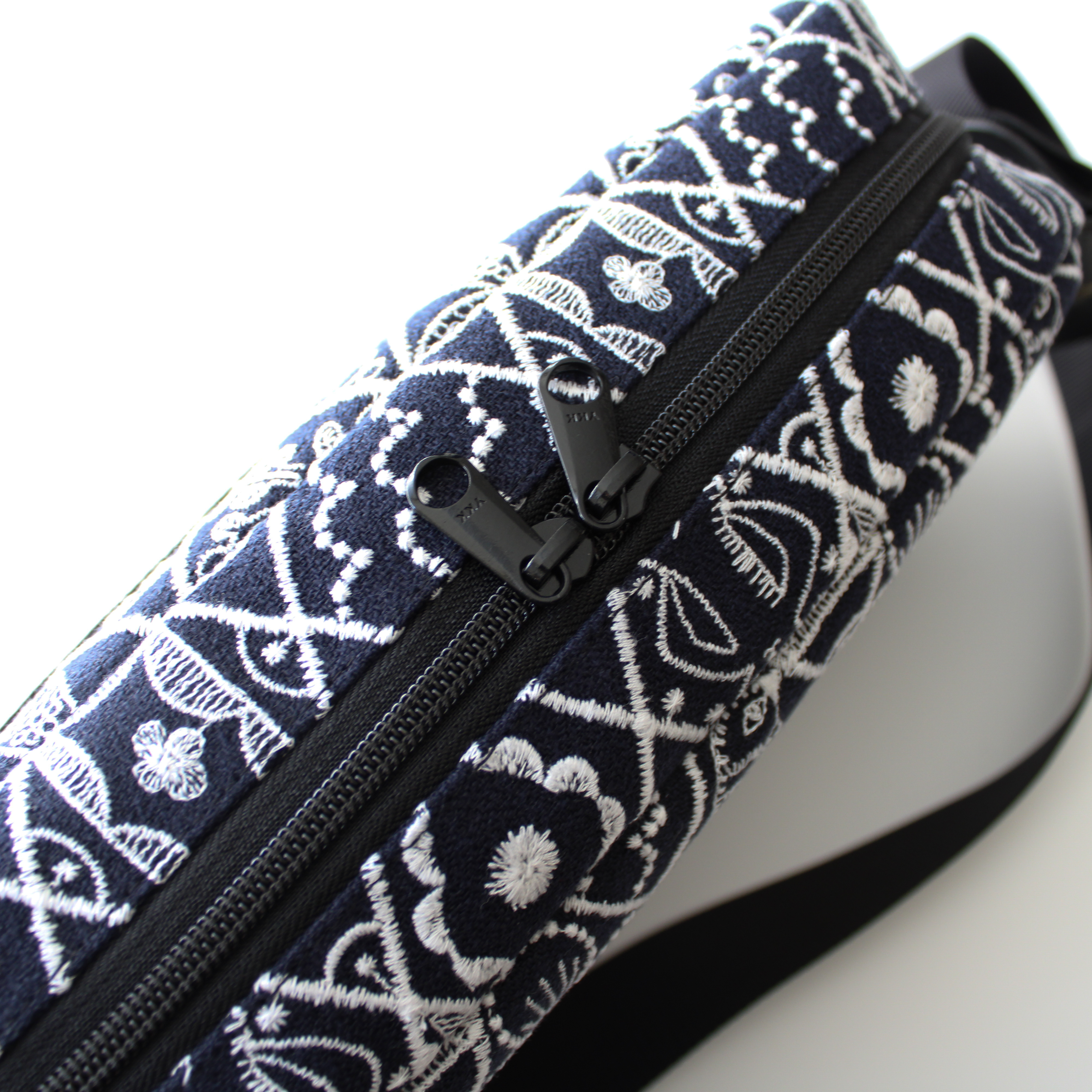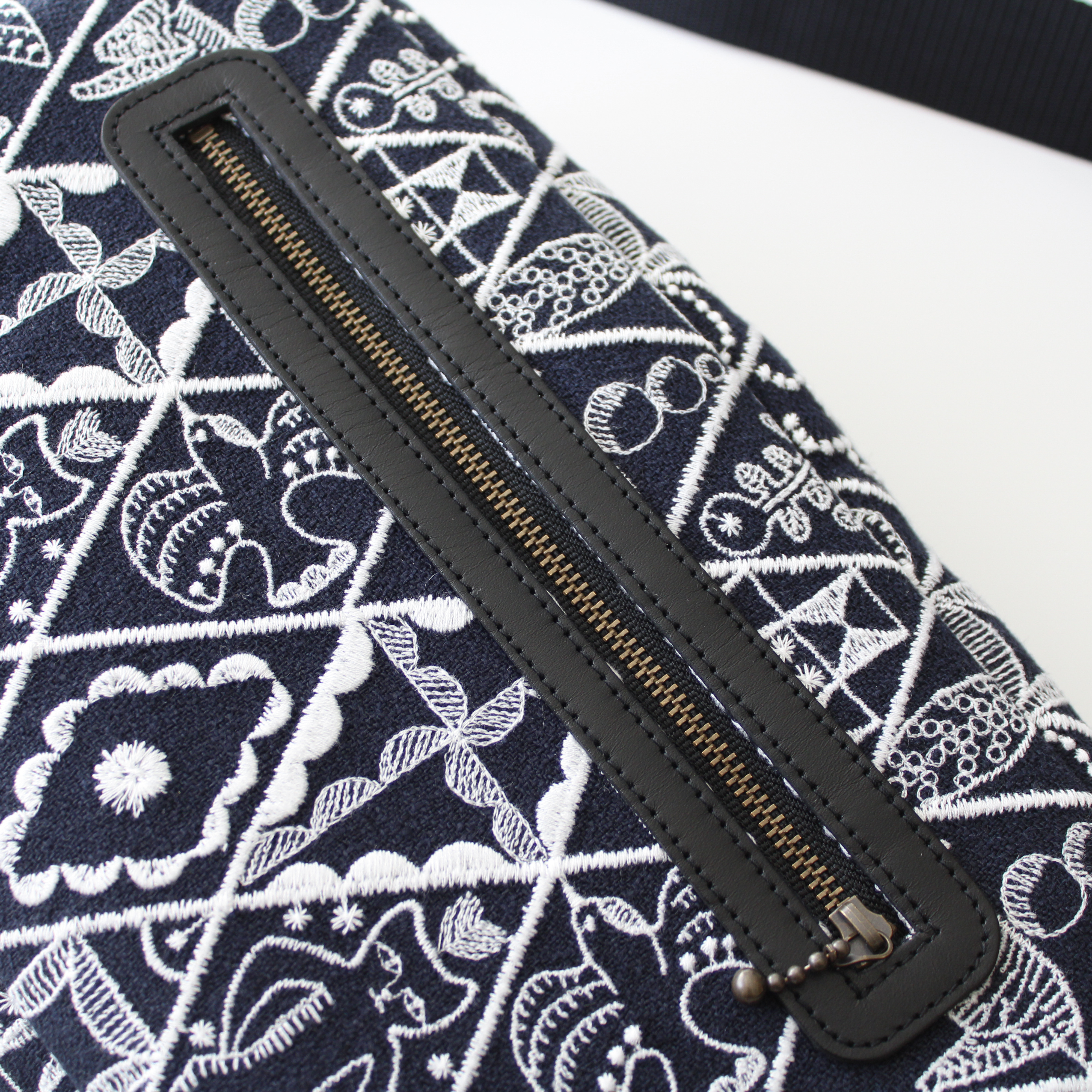 ☆自身の「ボディバッグ正面に開き口があると、開閉時に中の物が落ちてしまう」という悩みをもとに、ファスナーを上部に配置しました。
