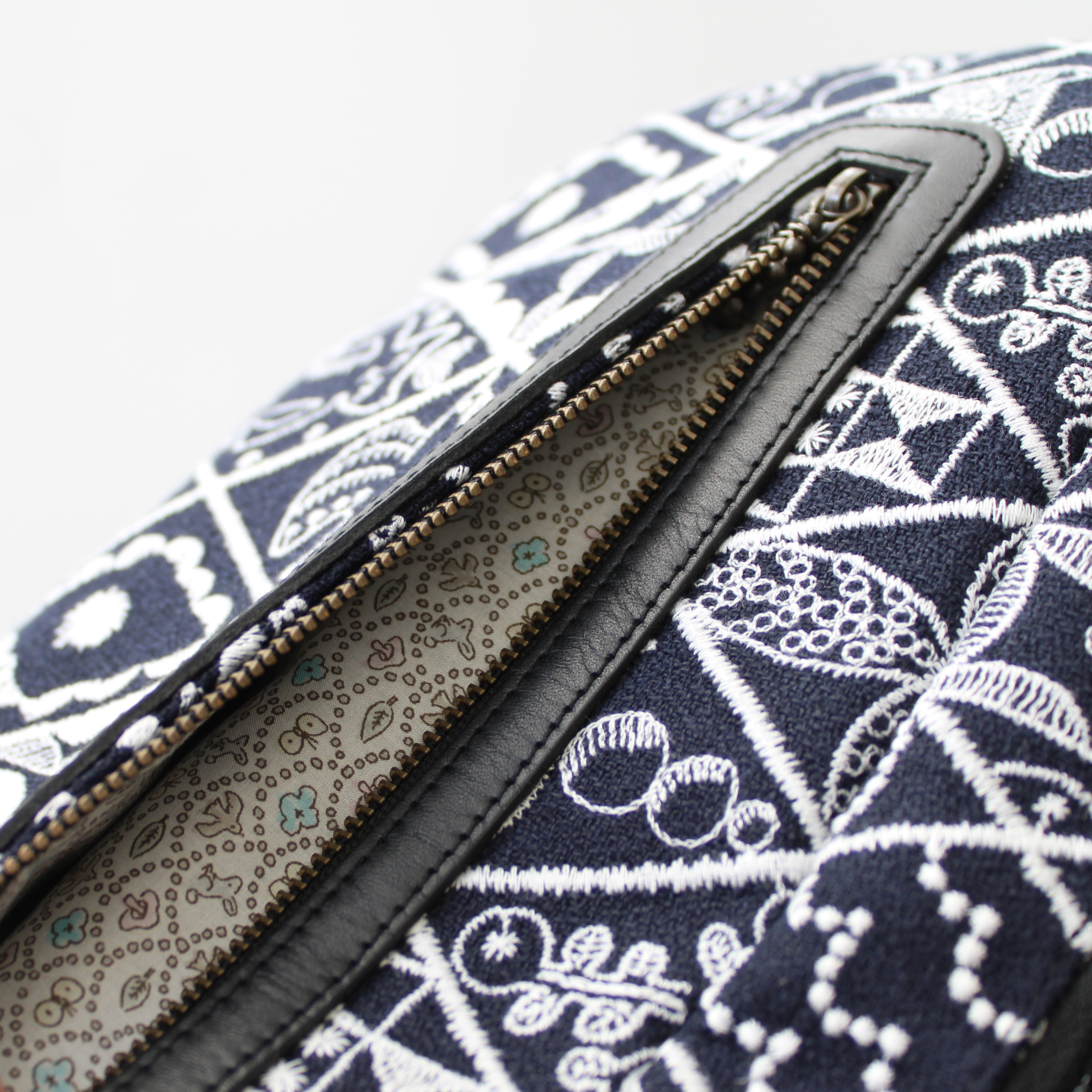 内側にはリバティとミナペルホネンのコラボレーションファブリック forest waveを使用した大小4つのポケットがあり、整理整頓も簡単です。